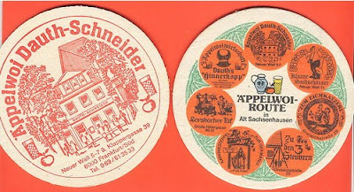 "Bierdeckel" gibt's auch für Äpfelwein bzw. für Cider. Hier Beispiele aus Irland und Deutschland. Oben sieht man einen Apfelwein-Untersetzer für 'Coopers Cider', unten einen Apfelweindeckel für 'Äppelwoi Dauth-Schneider' aus Frankfurt.